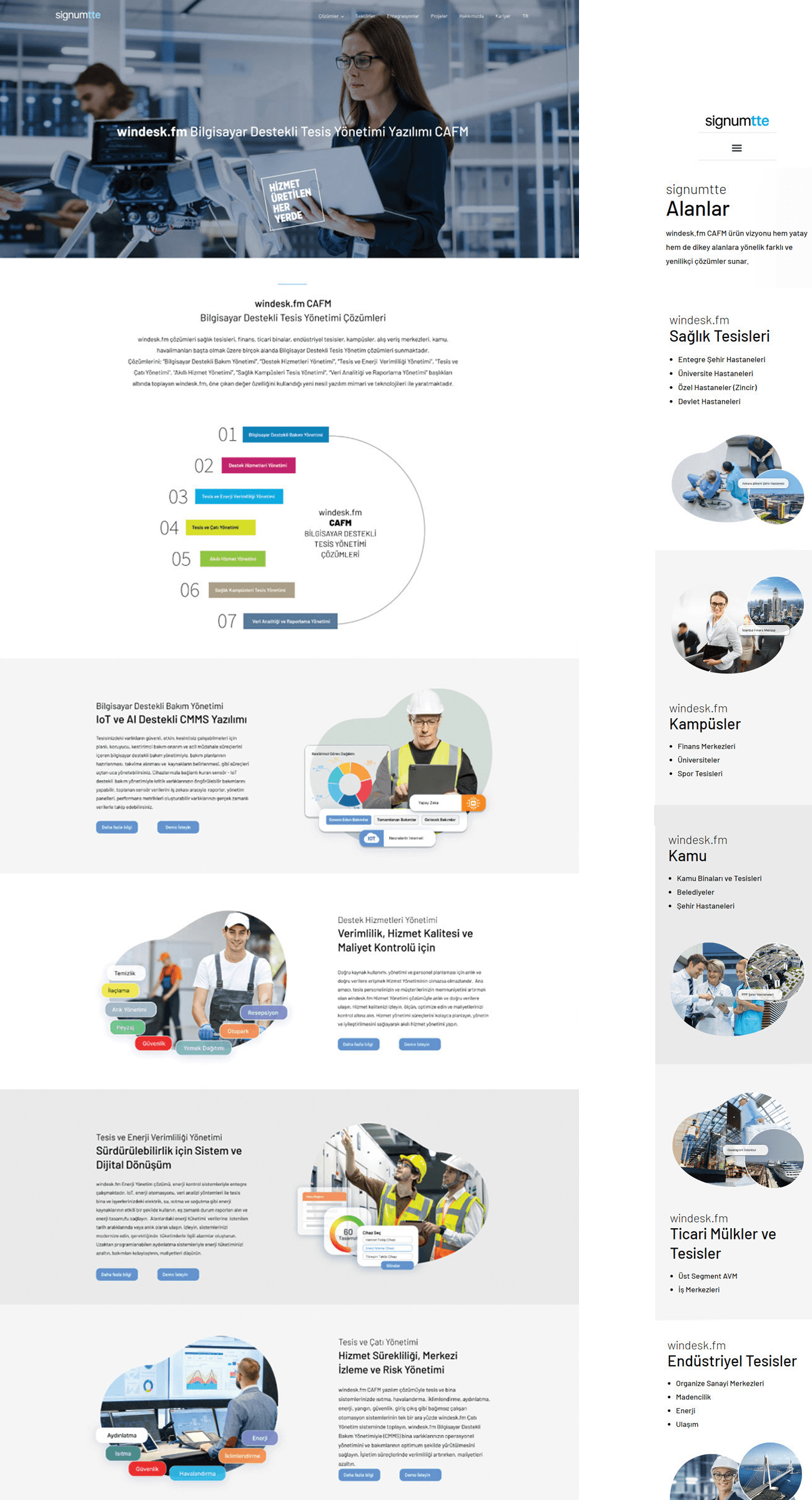 Signum teknoloji için hazırlanan web sitesinde “Windesk Platform”un anlatımının yanı sıra çözümler menüsünün altında yer alan 7 çözüm ve bu çözümlerden Entegre Tesis Yönetimi Çözümü’nün altında yer alan 14 uygulama kullanıcnın anlayacağı bir içerik yapısı ile detaylandırılmış, anlatımlar görselerle, projelerle desteklenmiştir. Minimal bir menü yapısı oluşturulmuş, sitenin basit, ferah, anlaşılır ve kullanıcı dostu olmasına özen gösterilmiş, hiç bir gereksiz sayfa ve yönlendirme kullanılmamıştır. Site üzerindeki geliştirilme çalışmaları devam etmeketir.
